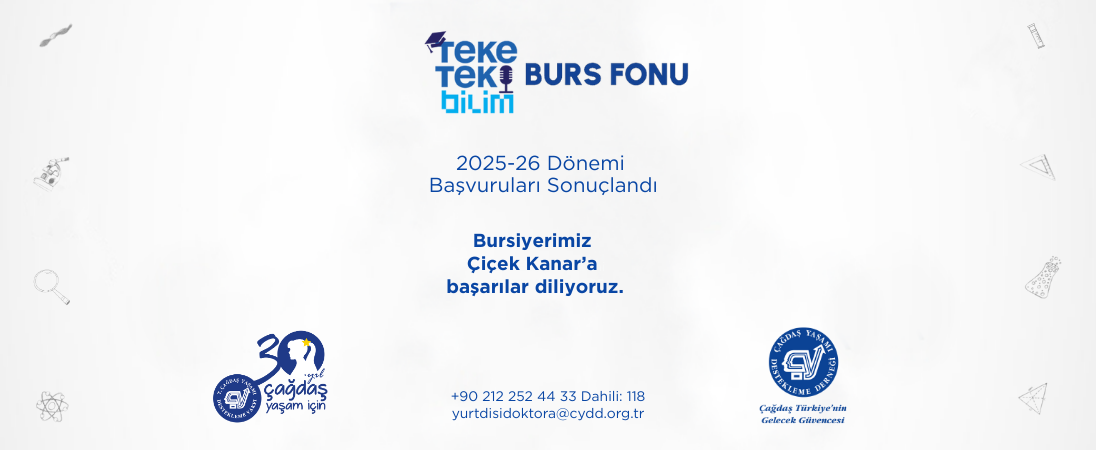 2025-2026 dönemi Teke Tek Bilim Burs Fonu başvuru süreci tamamlanmış olup, değerlendirmeler sonucunda bu yıl University College London U(CL) / İngiltere'de Moleküler Biyoloji ve Genetik alanında doktora çalışmalarını sürdürecek olan Çiçek Kanar burs almaya hak kazanmıştır. Kendisini tebrik ediyor, akademik yolculuğunda başarılar diliyoruz...