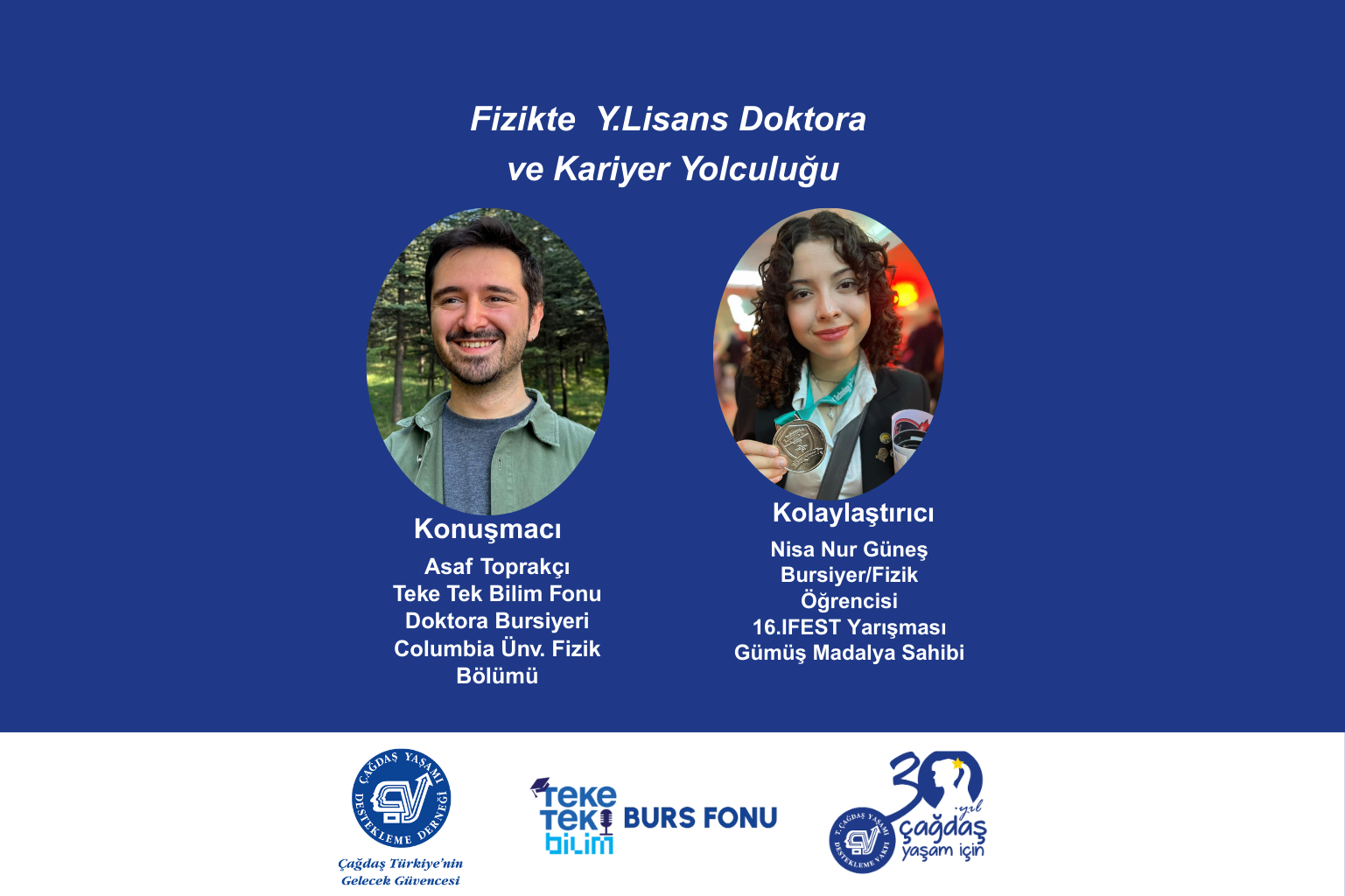 Çağdaş Yaşamı Destekleme Derneği (ÇYDD), Türkiye Çağdaş Yaşamı Destekleme Vakfı (TÇYDV) ve Teke Tek Bilim’in paydaş olduğu Teke Tek Bilim Burs Fonu kapsamında; ilk etkinliğimizi dün gerçekleştirdik. Bilkent Üniversitesi Fizik Bölümü’nü “Üstün Şeref Öğrencisi” olarak bitirdikten sonra halen Columbia Üniversitesi’nde Fizik Bölümü’nde doktora öğrencisi olan Teke Tek Bursiyeri Asaf Toprakçı’ya, kolaylaştırıcı olarak bursiyerimiz Nisa Nur Güneş eşlik etti. 1 saat olarak planlanan ancak katılım sağlayan öğrencilerin sorularıyla 1,5 saati aşan çevrimiçi toplantıda, Asaf’ın eğitimi, kariyeri, projeleri konusundaki deneyimlerini, karşılaştığı zorlukları, yaptığı çalışmaları kendisinden dinledik. Başta Asaf Toprakçı ve Nisa Nur Güneş olmak üzere toplantıya katılan tüm öğrencilerimize teşekkür ediyoruz. Hepinizin yolu açık olsun, bilim hayatınızdan hiç eksik olmasın.