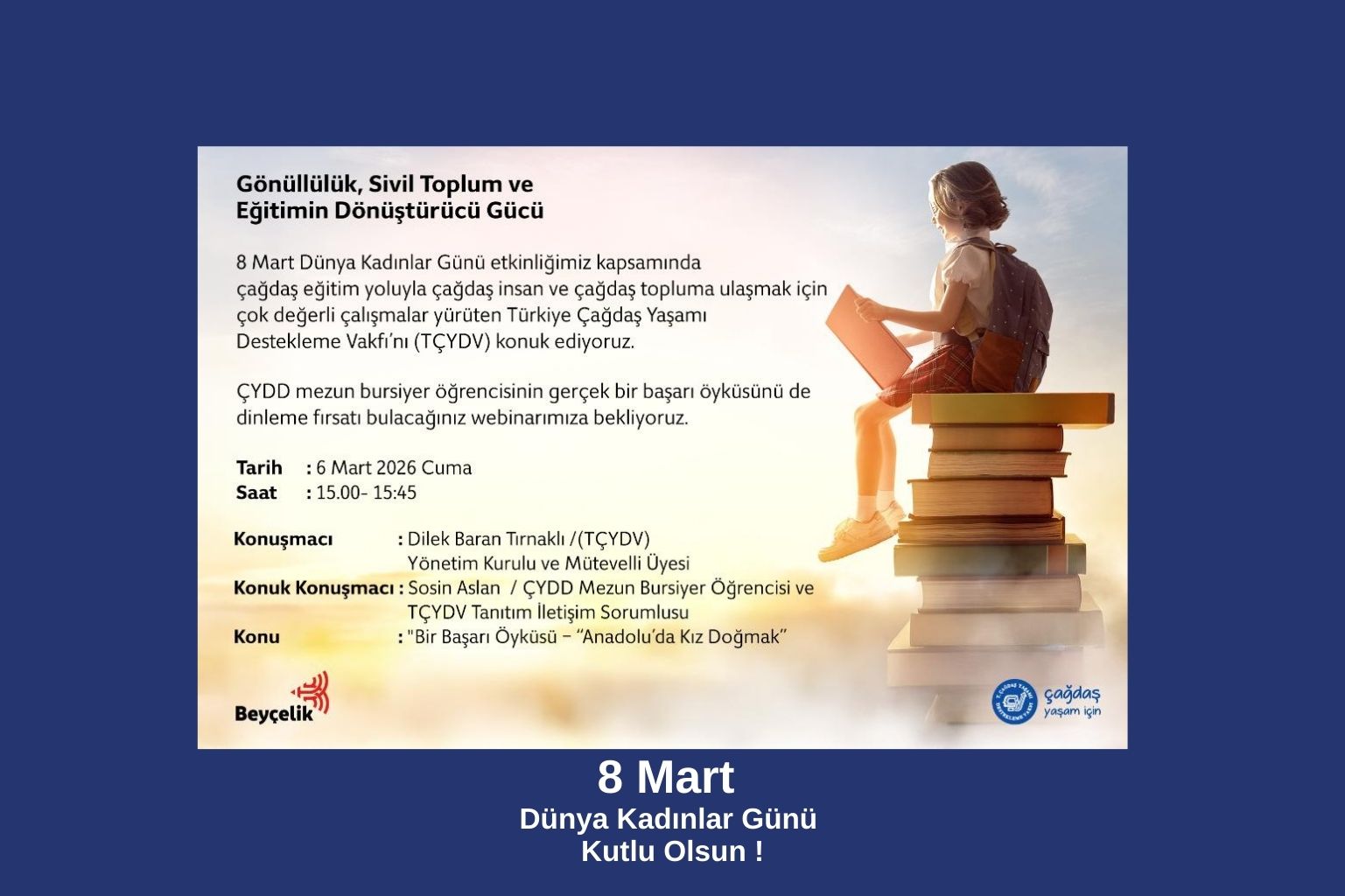 Türkiye Çağdaş Yaşamı Destekleme Vakfı olarak, toplumun eğitsel, kültürel ve sanatsal gelişimine katkıda bulunan bir eğitim vakfıyız. Prof. Dr. Türkan Saylan ve arkadaşları tarafından 1995 yılında kurulan Vakfımız,